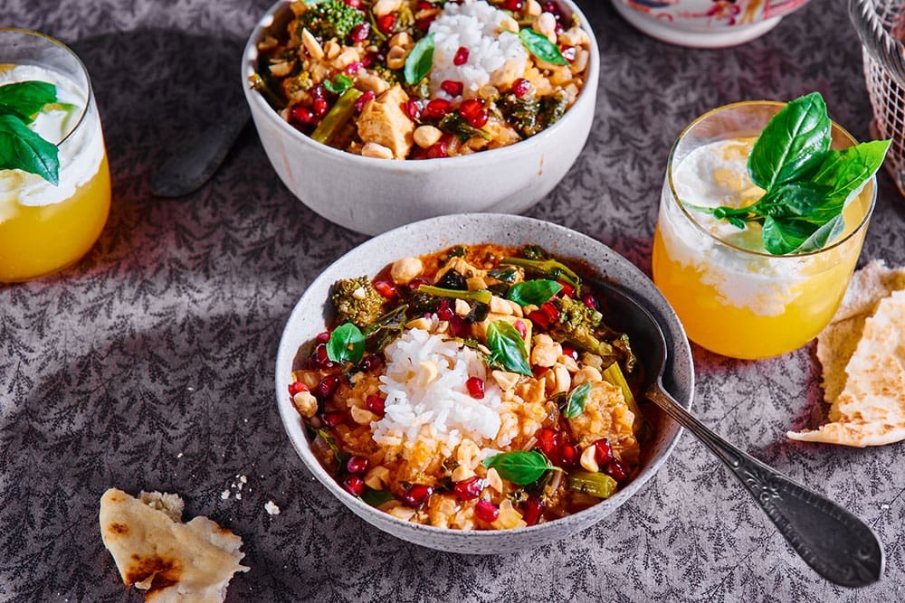 3. Serve the curry over a bowl of steamed rice. Top with pomegranate arils, peanuts and fresh basil or cilantro. Eat!