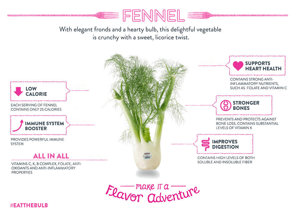 Fennel can be enjoyed raw or cooked. The bulb is 100% edible as the tender and whimsical fronds are great in salads or served as a topping for soups. The stalks can be used as dipping veggie sticks, chopped into stews or used for vegetable stock.