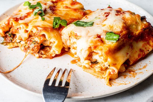 7. Cover the lasagna roll ups with the remaining tomato sauce and sprinkle with the remaining ½ cup of mozzarella cheese.