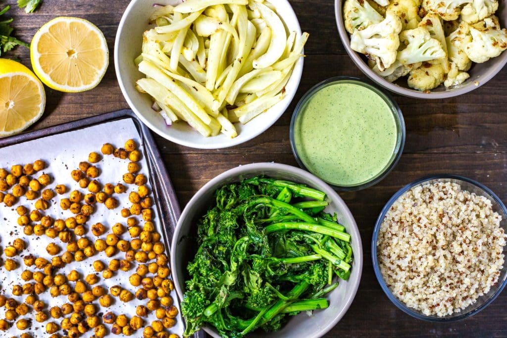 2. Meanwhile, prepare veggies and toss with remaining tbsp of olive oil and season with salt and pepper. Add to a parchment-lined baking sheet and roast in the oven for 20 minutes.