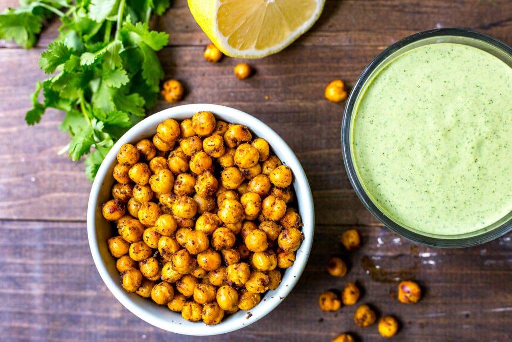 1. Preheat oven to 425 F. Line a baking sheet with parchment paper. Drain can of chickpeas and toss with 1 Tbsp olive oil, chili powder and garlic powder in a large bowl. Add to baking sheet and roast for 20 minutes until chickpeas are slightly crispy.