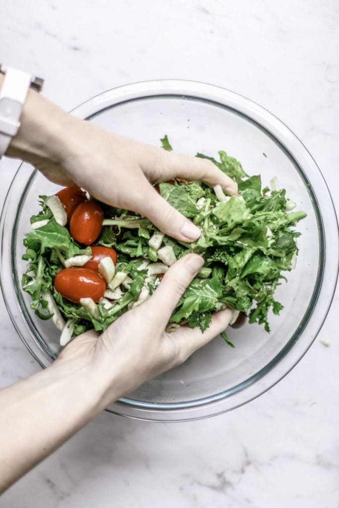 5. Place the fennel, tomatoes, olives, and broccoli rabe into a large bowl. Drizzle with olive oil and season with salt and pepper. Toss the salad with your (clean!) bare hands, gently massaging the oil into the broccoli rabe leaves. (The florets don’t need to be massaged.) You can add a bit more oil if needed. Once the salad is well tossed, spread it out over a baking sheet and roast for about 15 minutes, or until the tomatoes burst and the fennel is tender. Stir halfway through cooking time.