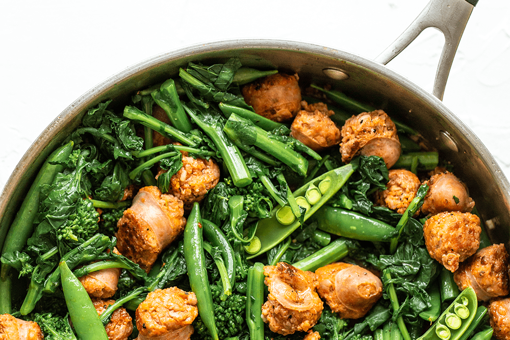 6. Saute the sausage for about 8 minutes, or until it is browned. Add the garlic cloves, snap peas, salt and pepper and saute for 3 minutes before adding the broccoli rabe back to the pan. Cook everything for 2 minutes.