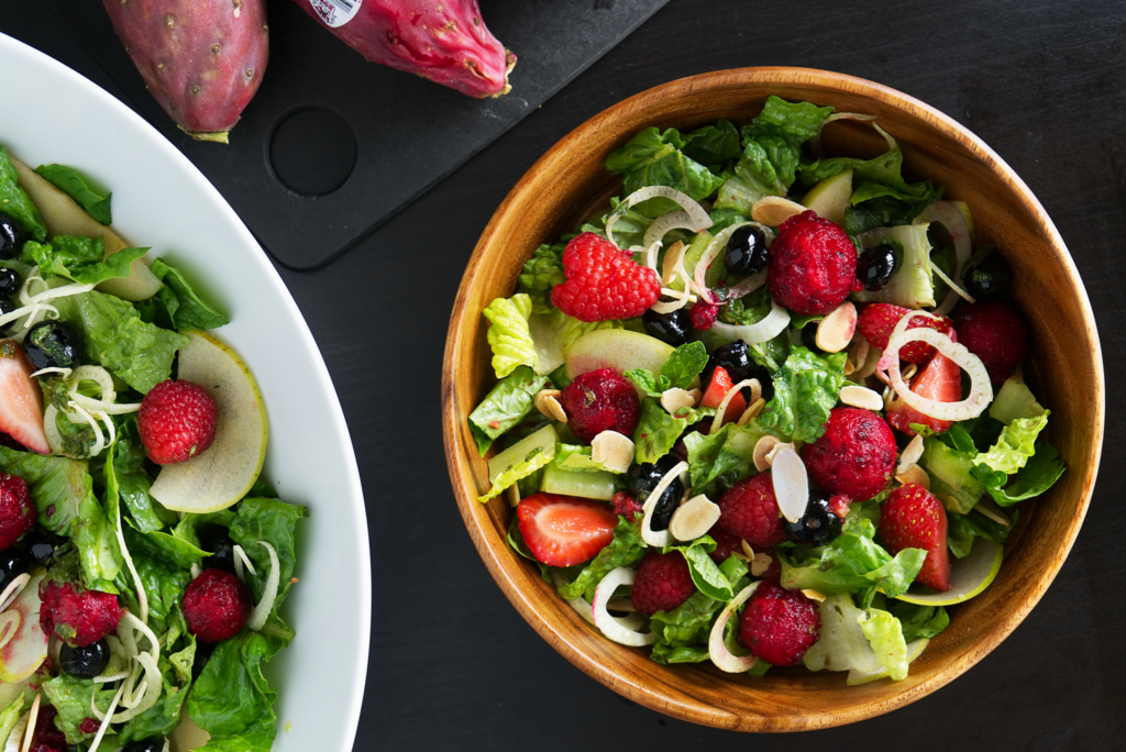 End the month on a high note. Add some red, white and blue to your Memorial Day Weekend spread with this Romaine Salad with Cactus Pear, Mixed Berries, Fennel, Apple and Basil Vinaigrette. This salad is a go-to for a filling, yet light, refreshing summer lunch. If cactus pears are not available near you, extra berries will do the trick!