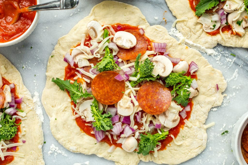 3. Line a baking sheet with parchment paper, then add rolled out dough. Spread each piece of dough with pizza sauce, being careful to leave some space along the edges. Top with mushrooms, pepperoni, broccoli rabe and red onion, then add cheese and fresh basil.