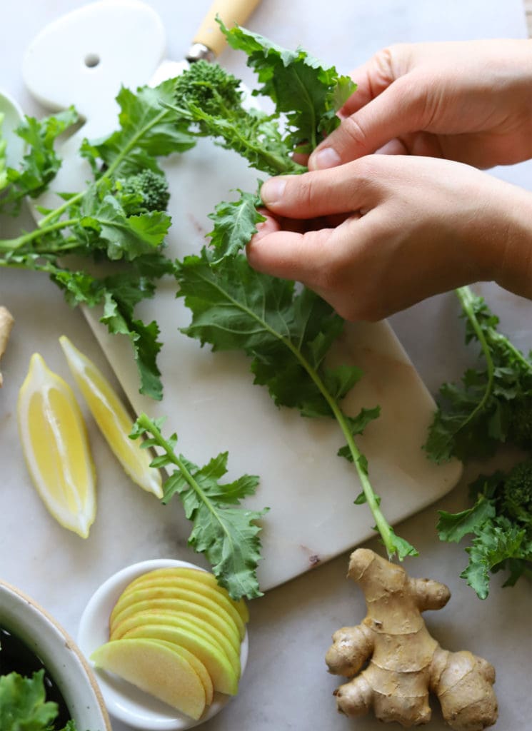 2. Add some of the apple to the juicer first. Then add the broccoli rabe leaves, followed by the cucumber pieces, ginger, more apple and lemon (until all of the produce has been juiced).