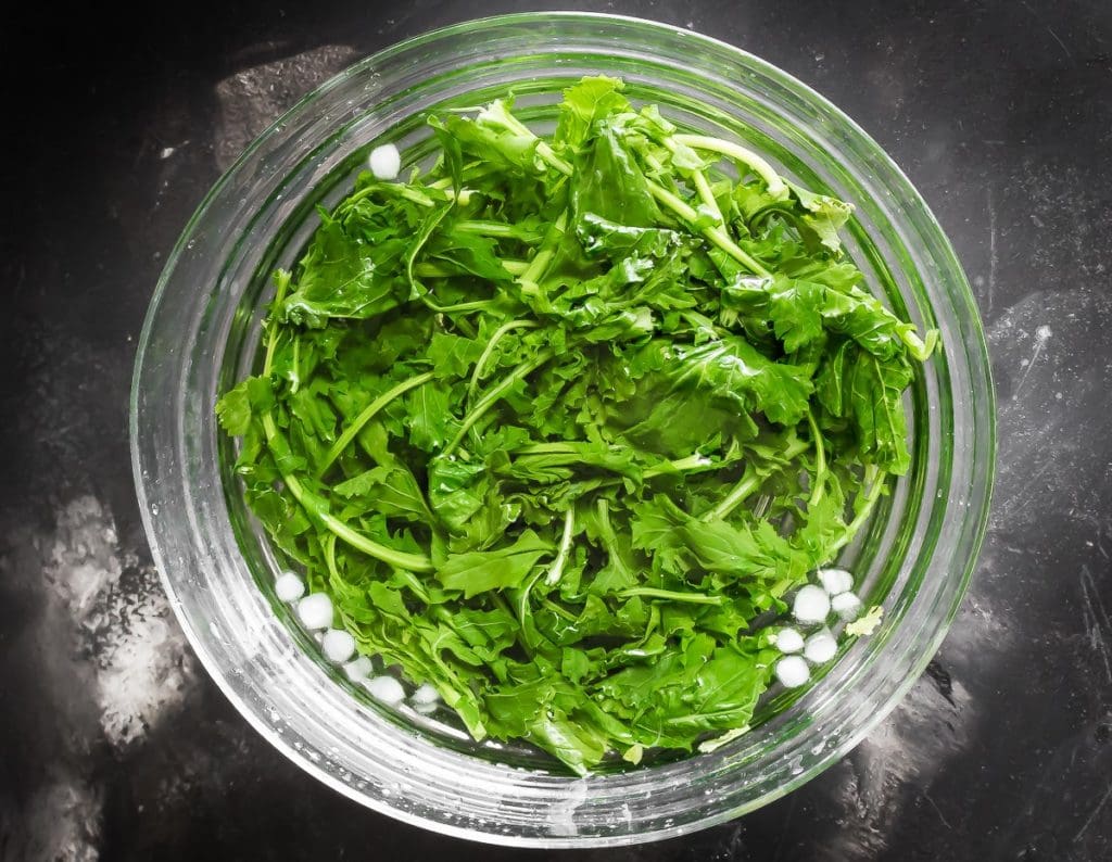 2. While your veggies are in the oven, cook the broccoli rabe. Trim the stems. Place about 4 cups of water in a saucepan and bring to a boil. Add broccoli rabe to the boiling water and cook for exactly 1 minute. When ready, transfer the broccoli rabe into a bowl of ice water for another minute. Remove the broccoli rabe from the ice water and set aside. Mix crab meat and chili sauce in a small bowl and set aside for topping.