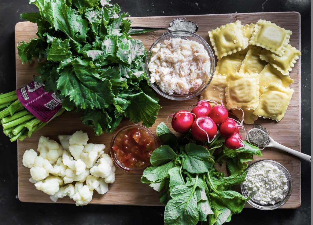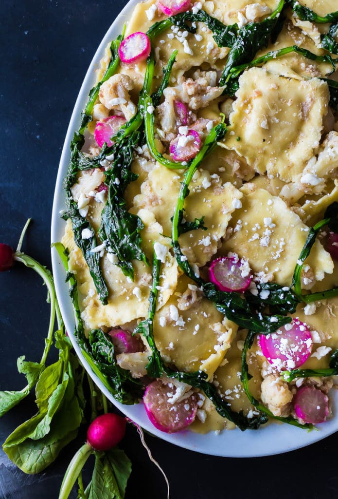 4. Add roasted cauliflower and radishes, broccoli rabe and crab meat to the ravioli bowl. Toss with dressing and transfer to a serving plate. Top with light feta cheese. Enjoy!