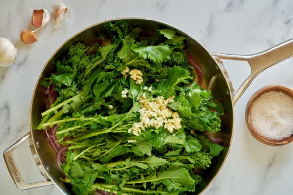 2. Add the broccoli rabe and garlic. Season with ½ tsp salt. Cook until the broccoli rabe stem is tender and the leaves are wilted, tossing to coat, 8-10 minutes.