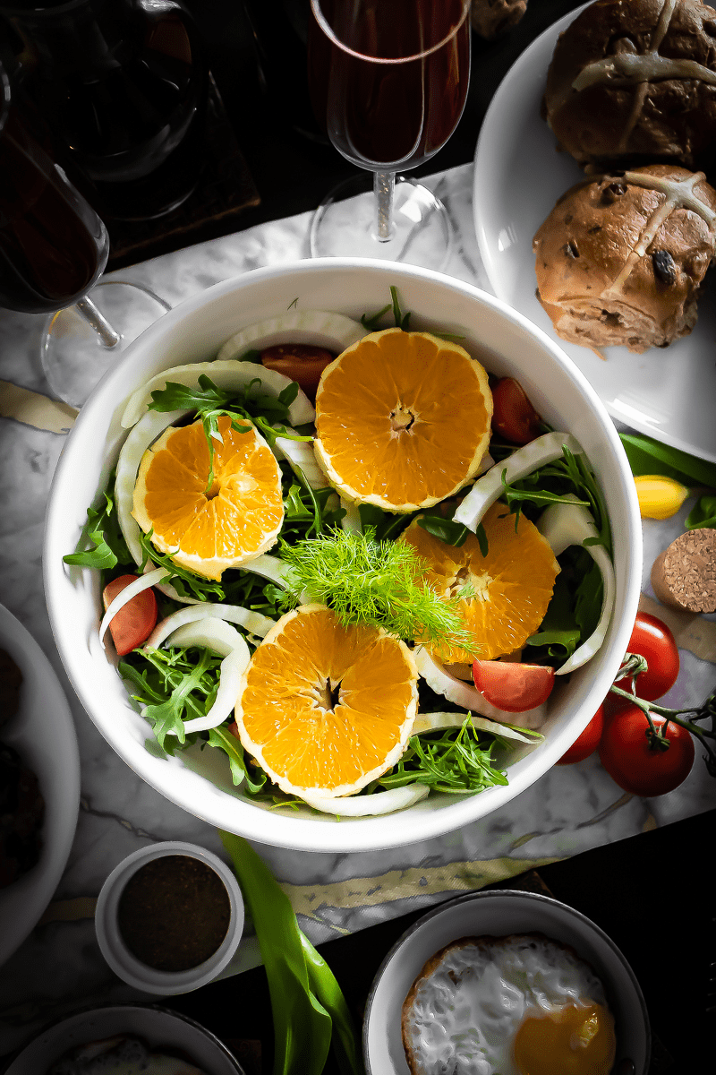 Citrus Fennel Salad contains arugula, sliced fennel, 1 large sliced navel orange, and cherry tomatoes. Dressing was a mixture of balsamic vinegar and olive oil.