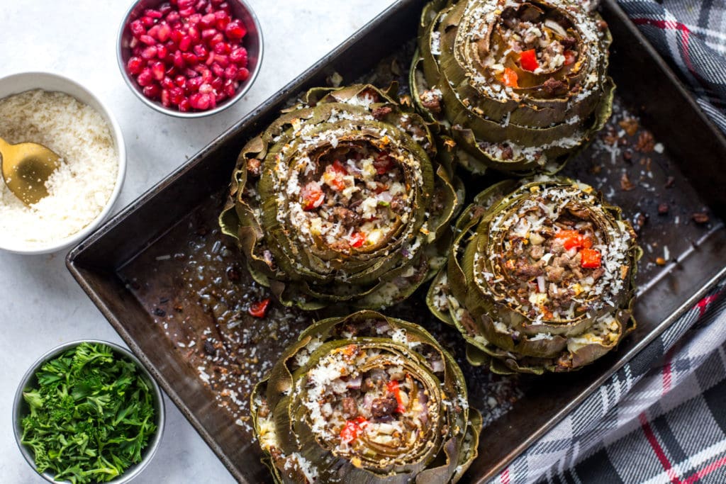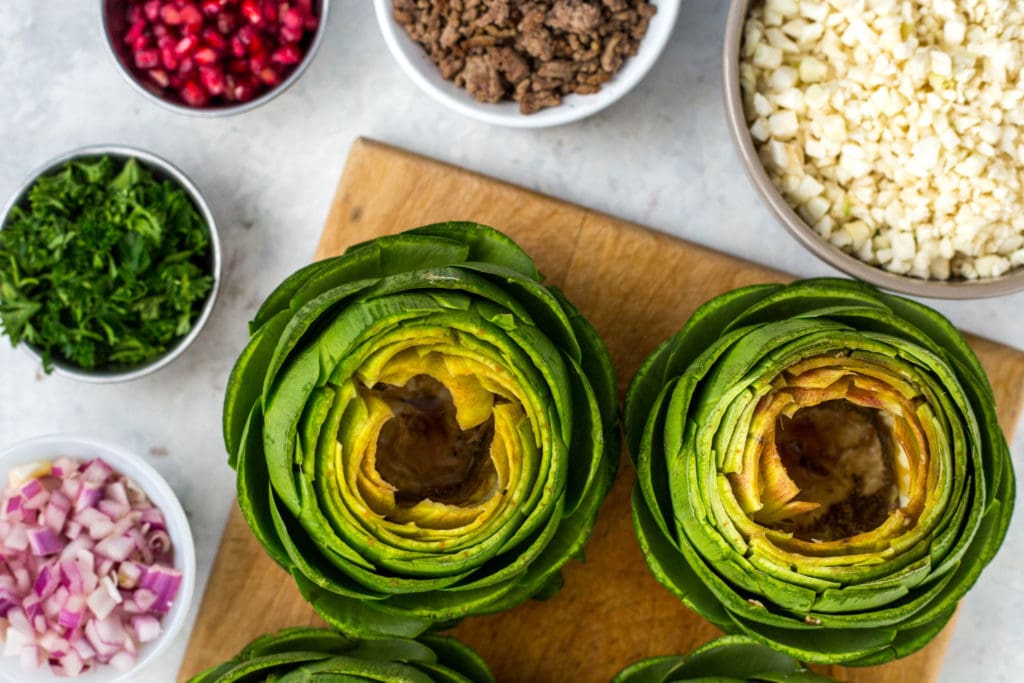 These Stuffed Artichokes are filled with riced cauliflower, ground beef and parmesan cheese for a delicious, unique way to celebrate the holidays! Topped with pomegranate seeds and parsley, these vibrant stuffed artichokes are filled with simple ingredients that really shine!