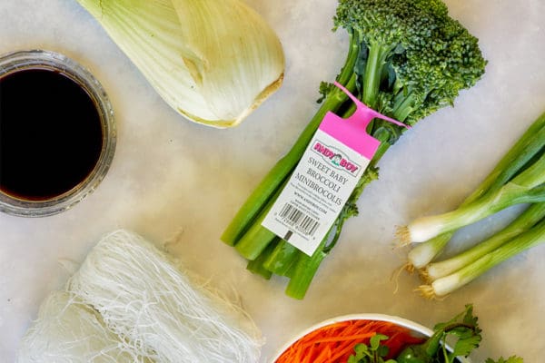 - Divide the noodles between 4 bowls. Ladle the soup into the bowls over the cooked rice noodles. Top with 2 sweet baby broccoli per bowl and carrots. Serve with the lime slices, radish sprouts, cilantro, basil, sriracha, chili peppers, more soy sauce, and soft-boiled eggs.
