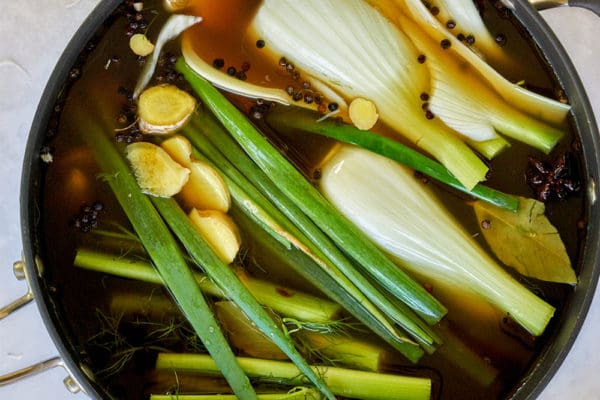 - Add the vegetable stock, pinch of sugar, ginger, fennel, bay leaves, soy sauce, rice vinegar, and scallions. Simmer for 20 minutes, then strain everything out and return the liquid back to the pot. Keep hot until ready to serve.