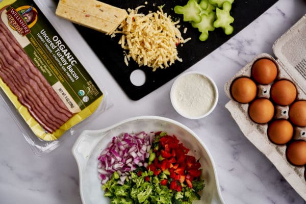 2. While rice is cooking, prep the veggies. Cut broccoli into small florets. Cut and finely chop stems as well, adding to a large bowl. Add the rest of the ingredients and toss.